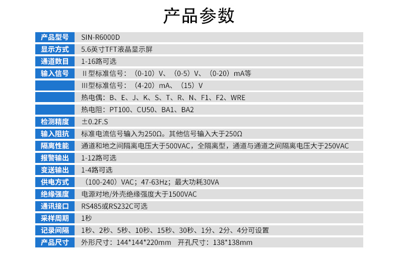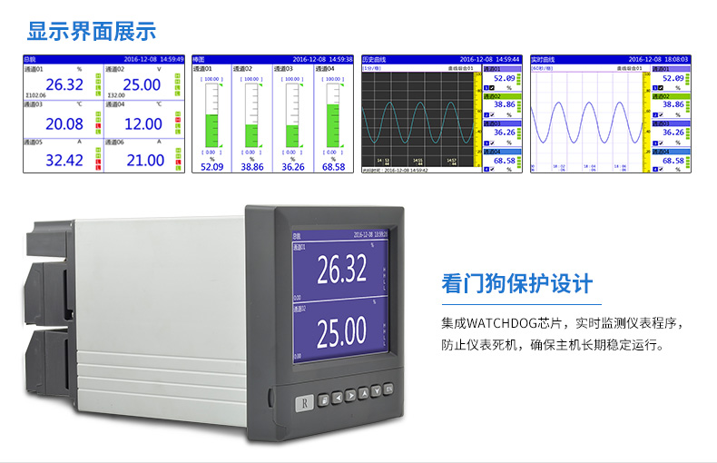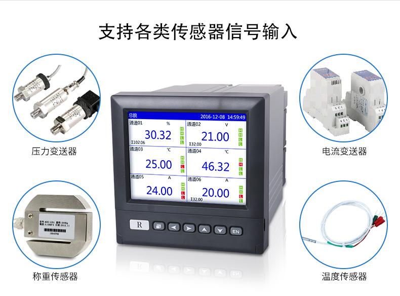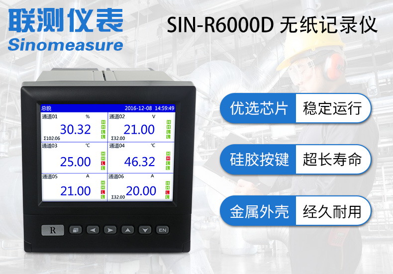 SIN-R6000D系列無紙記錄儀是一種高速高性能微處理器和5.6英寸彩色液晶顯示屏,對現場各種溫度、壓力、流量、電量等信號實現監測、控制和記錄功能。 SIN-R6000D系列無紙記錄儀可自由組態輸入標準電流、標準電壓、熱電偶、熱電阻、頻率等信號,可實現為傳感器配電和繼電器報警輸出,并且可通過U盤或通訊方式與上位機進行數據交換。